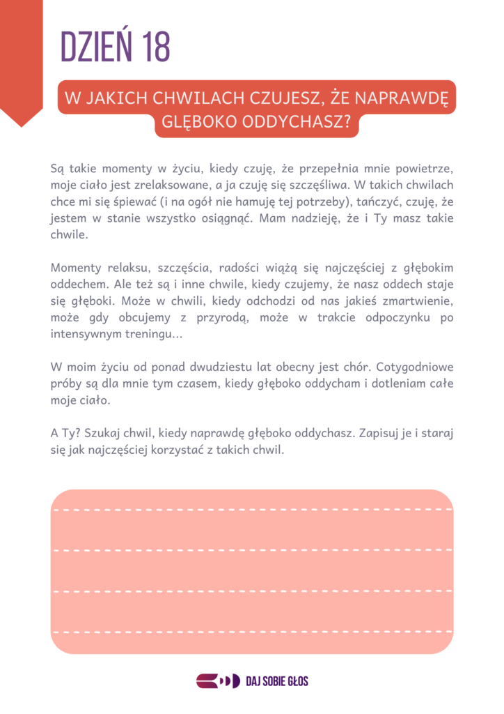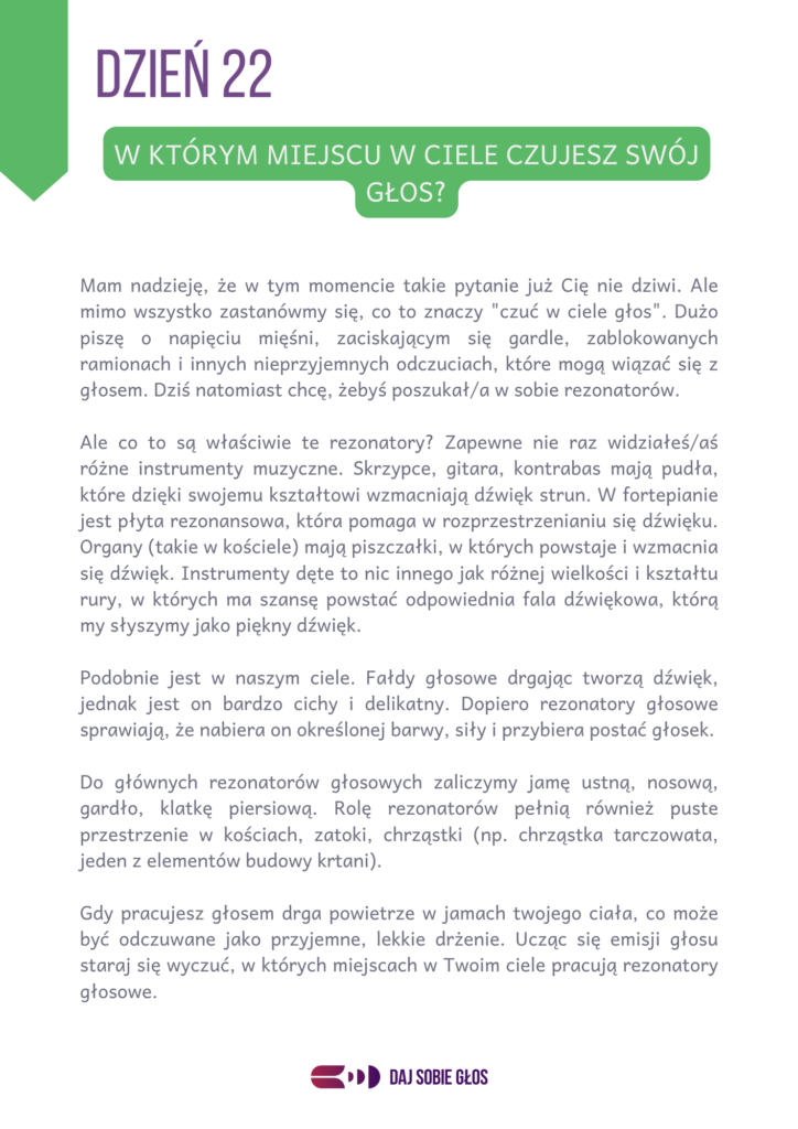 Zdobądź ebooka 30 dni dla głosu! i naucz się podstaw emisji głosu. Zrób ćwiczenia, które pomogą Ci poznać swój głos, pogłębić oddech i poprawić brzmienie.